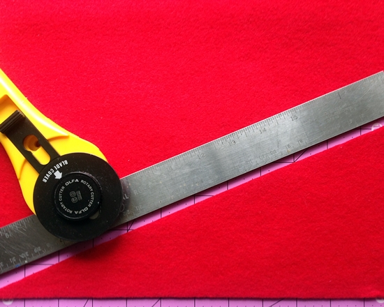 - Cut a 12” by 27” piece for case. Place ruler at one corner of 12” end of felt piece. Measure 5” up on opposite side of felt piece. Angle ruler at 5” mark. Cut piece off.