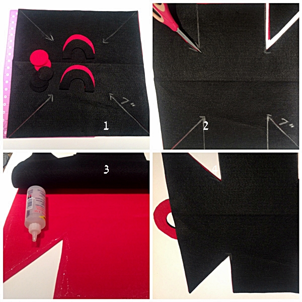 - Glue handle pieces in pairs, smoke with pink and black with red. Place cut squares in pairs on top of each other, red with black, and smoke with gray. Glue along all edges.