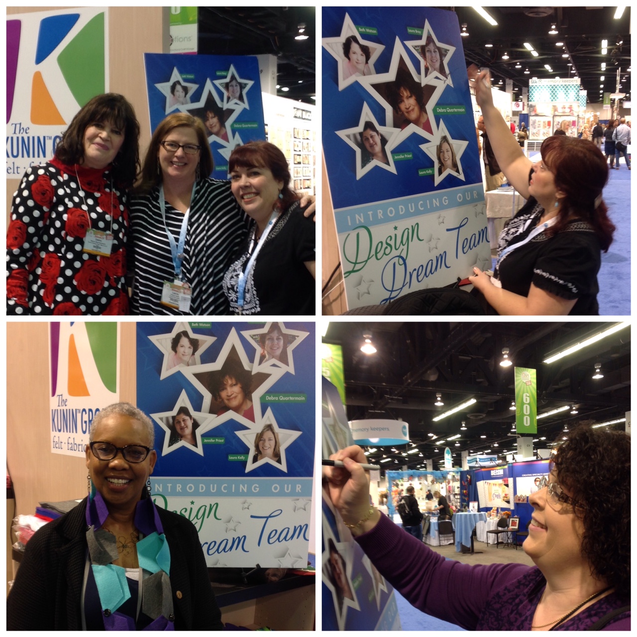 Our Dream Team was busy in the booth doing MITI’s (Make and Takes) with show attendees. Laura Bray, Laura Kelly, Jennifer Priest and Beth Watson made fun felt projects comprised of hearts, butterflies and flowers, fashioned into cases, hoops, pins to wear. I created some scarves and mug rugs with attendees. Here is one happy lady who wore her scarf during the show! Beth Watson shares her tutorial for her MITI on Thursday.