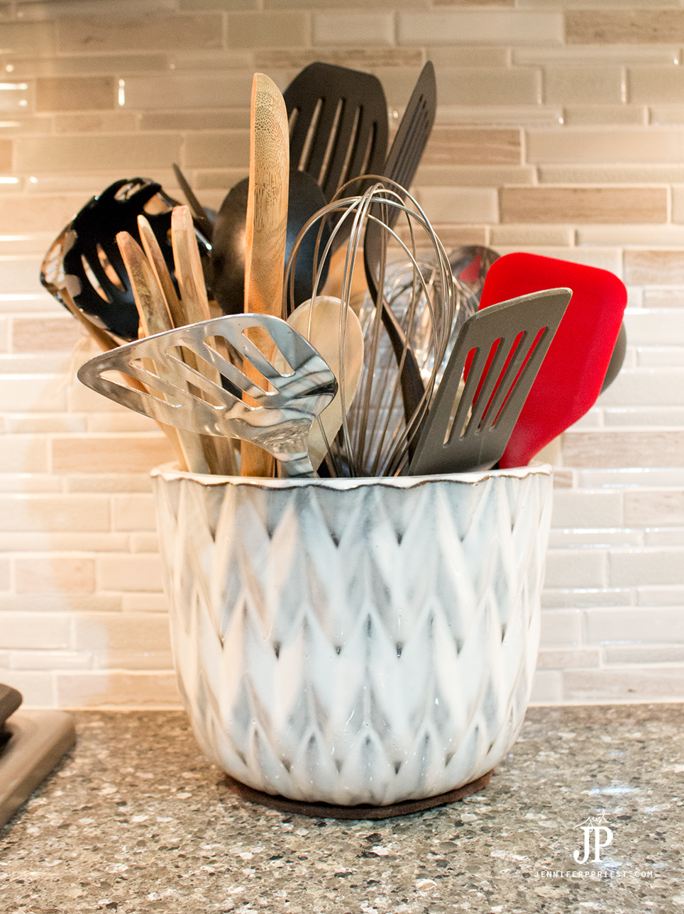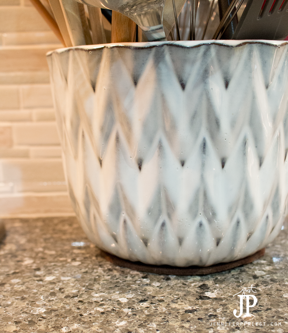 We found use large flower pot to store all of our cooking utensils in on the kitchen counter. I just got brand new quartz counter tops installed so to protect them, we cut out a circle of felt and placed it under the pot. This way we can safely slide the pot out of the way for cleaning.